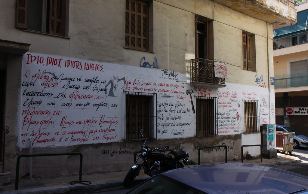 | Laiki-tori kadulla Ateena, talvi 2014 | Katutaidetta Pink Floydin hengessä Ateena, talvi 2014 | Köynnösten peittämä talo Ateena 2014 | Taidetta leikkipuiston aidassa Ateena 2014 | Korintinlahden suu ja Rion silta Kevät 2014 |